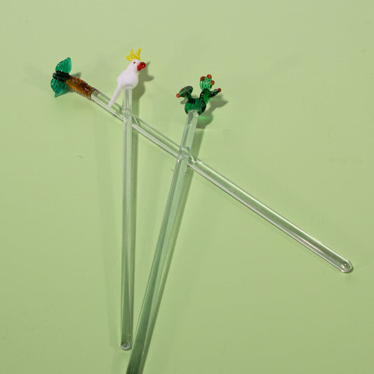 Vintage Glass Swizzle Stick Set (Palm Tree, Cactus, White Cockatoo), 1970s