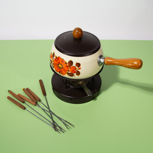 Vintage Enamel Fondue Pot Set, Mid-century 1970s