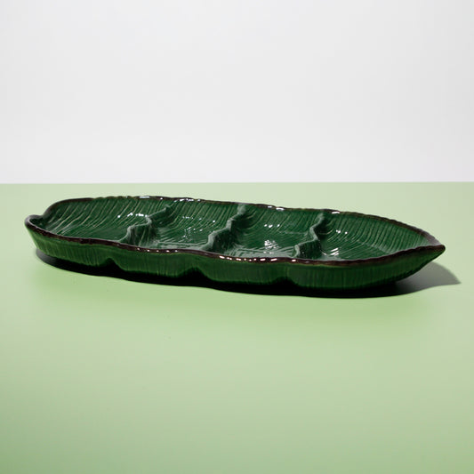 Vintage Green Ceramic Leaf Appetizer Tray, Mid-century 1950s
