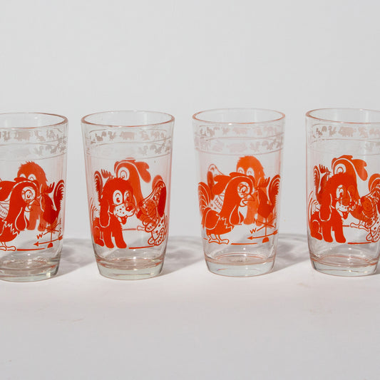 Vintage Puppy Dog & Rooster Small Drinking Glasses, Mid-century, 1950s