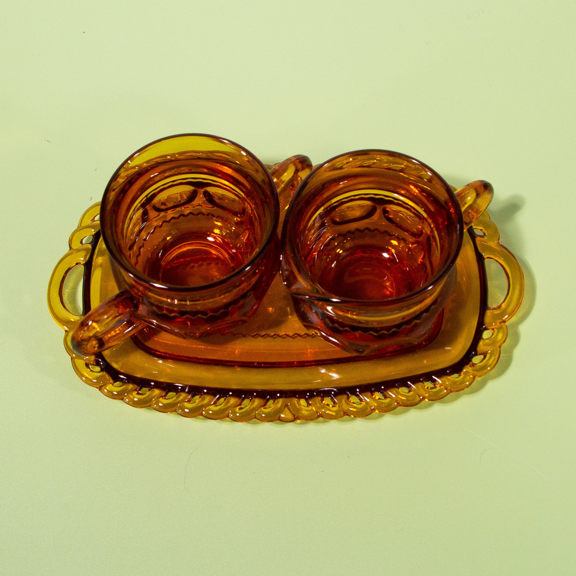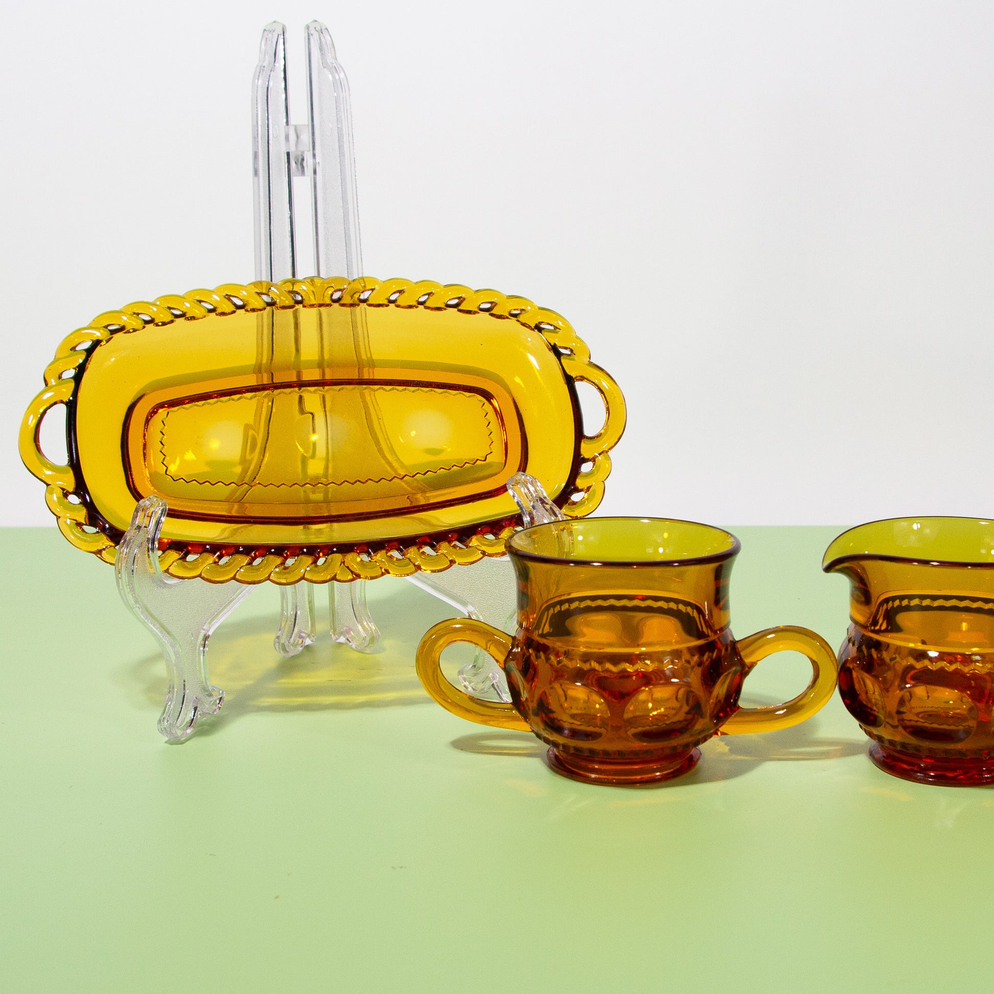 What an elegant addition to your kitchen coffee corner. This set of vintage amber glass sugar & creamer holders and beautiful decorative saucer will certainly add charm to your daily coffee experience.