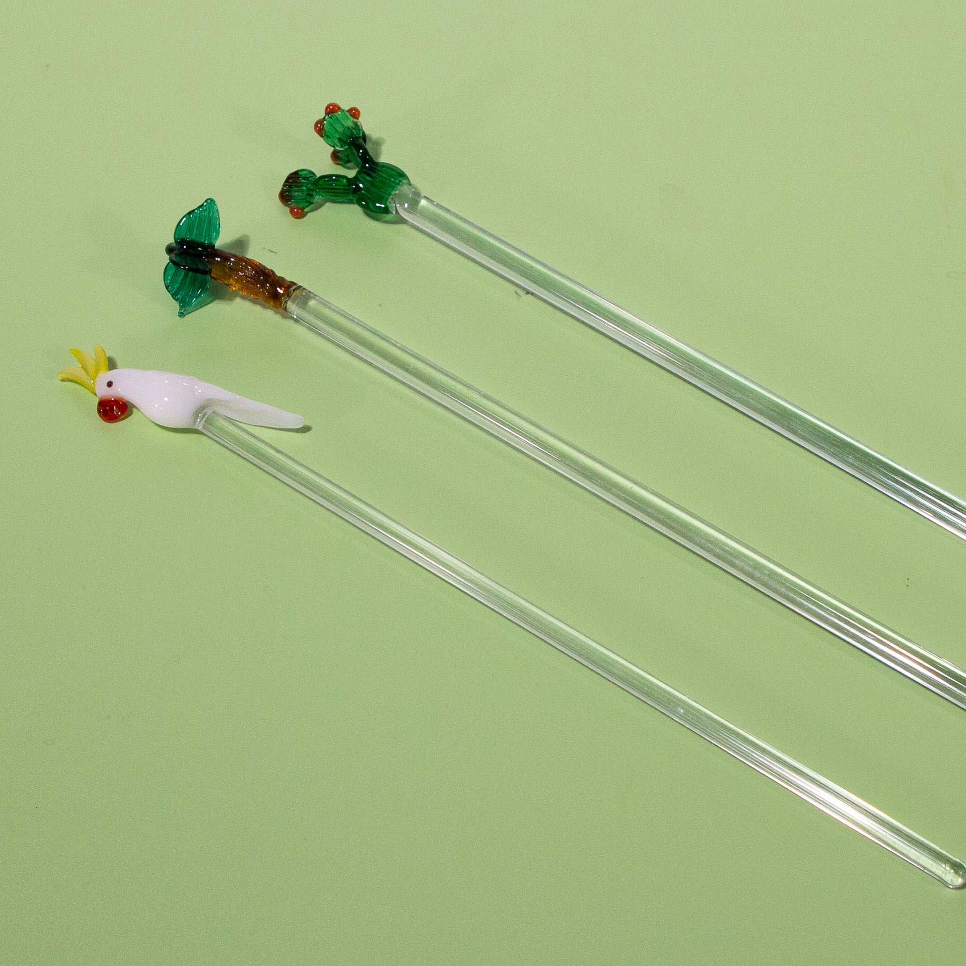 Vintage Glass Swizzle Stick Set (Palm Tree, Cactus, White Cockatoo), 1970s