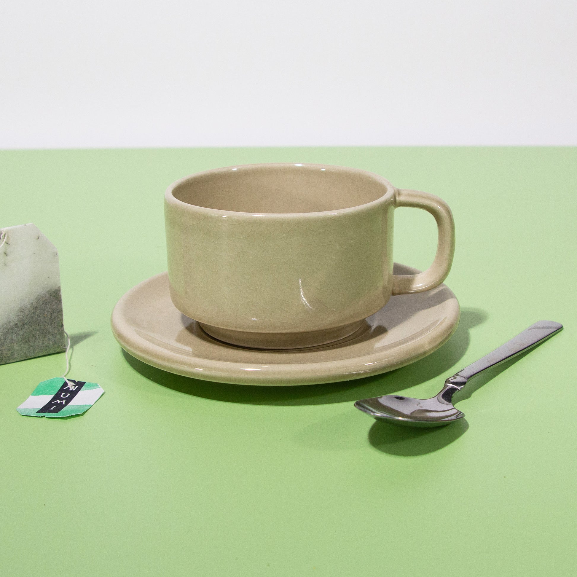 Vintage Tan Mugs with Saucers, 1970s, Made in the USA